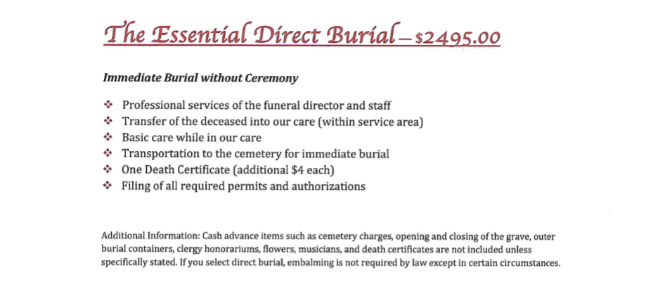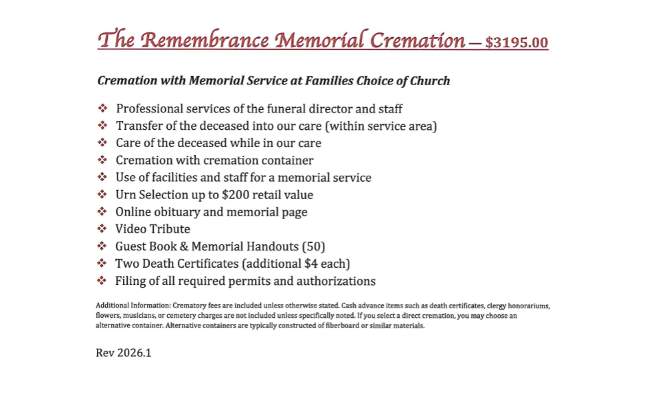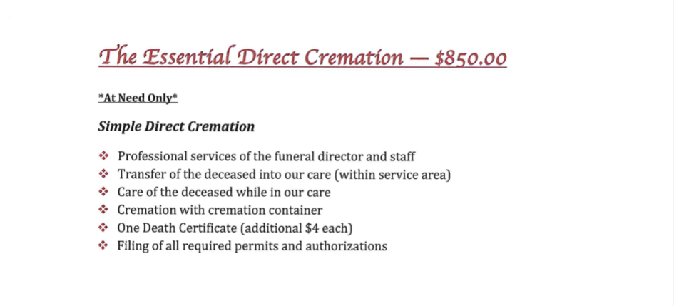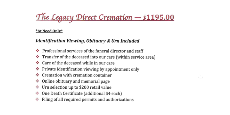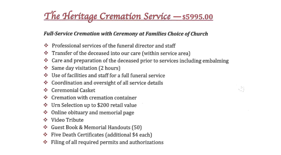 - Crematory fee (crematory located at our funeral home)