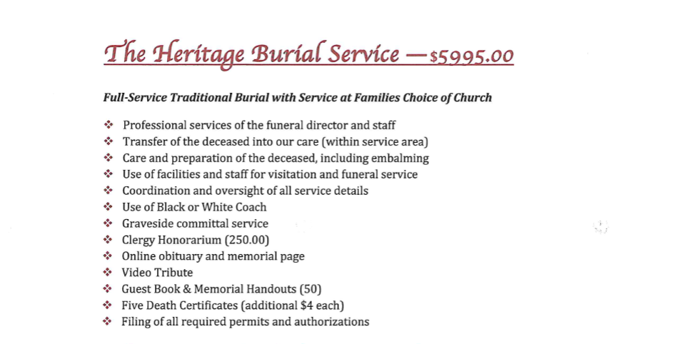- Use of equipment and staff for arranging and coordinating service at cemetery of families choice within Tarrant County