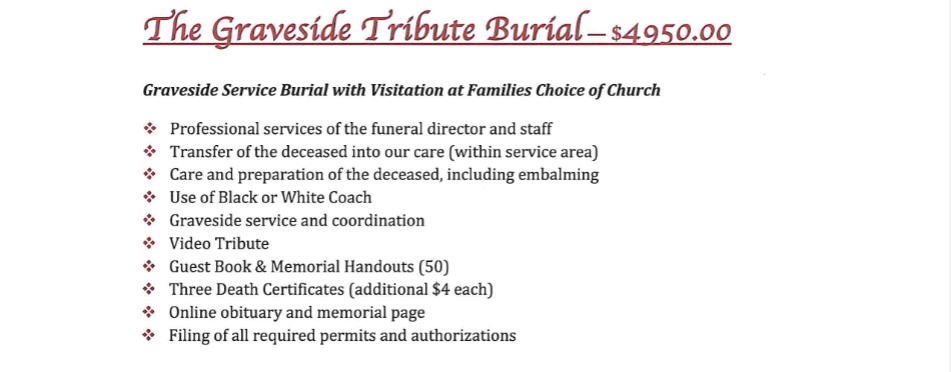 Outside charges such as Flowers, Newspaper Obituary and Cemetery are to be added per family request.
